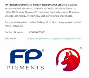 We are pleased to announce the Technical Collaboration with   FP Pigments in India under the brand name STABICON ™. This is a   White pigment Opacifier and Partial to Full Tio2 Replacement Product mostly used in PAINTS & COATINGS, PLASTICS, INKS AND PAPER INDUSTRIES and Other Applications. Foxcon™ Elements Company is part of  Ra Chemicals, India.